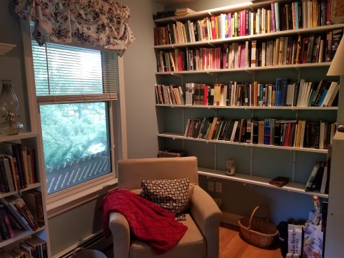 My husband was nice enough to install new shelves and my space doubled. So I do have some room to grow! Good luck with the move. Boxing up books is so tedious.