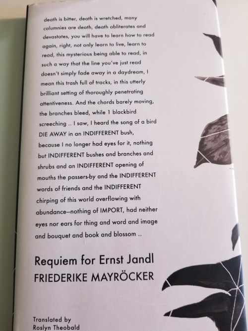 I’ve read two other books on grief recently: Will Daddario’sTo Grieve and Max Porter’s Grief is a Thing with Feathers. Of all these, Mayrocker’s text elicited the most emotional response from me. Her multifaceted response to grief in all its forms—emotional, philosophical, social—struck a nerve.