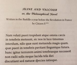 John: I’d been involved with Sade’s work since the late 1980s, and I knew something about his increasing significance as a literary icon across the 20th century; and it seemed to me he was exceptionally relevant today, in a time of political and social turmoil. I’d read his novel Juliette very carefully, making an index of its themes and characters. But I only actually read Aline and Valcour when we translated it. I was astonished by its coherence, by Sade’s attention to character and to the wealth of ideas that they express. It’s not at all didactic like Rousseau can be in his fiction, nor is it a libertine tale like Les Liaisons Dangereuses. Rather, as he states, it’s a philosophical novel that takes you through a complex story weave from beginning to end.