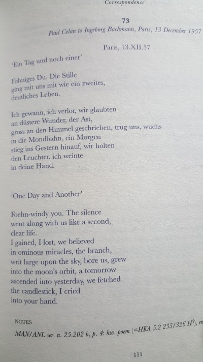 The excerpts from these two letters are typical of the feelings of absence and yearning that the authors feel for one another. Stolen moments on brief trips to Paris, telegrams, and letters are not enough to satisfy either one of them. But as the years progress and they continue with their letters, a deep sense of trust, friendship, love and mutual understanding is sustained between them. Bachmann becomes for Celan a champion of his work and a mortal and emotional support. In the early years of their communication she is constantly receiving his poems, giving him feedback and trying to get his work published in various literary magazines. When the Goll plagiarism scandal happens, she writes to him and encourages him to put that incident behind him. I also found it sweet and endearing that they continue for many years to exchange books as gifts on one another’s birthdays and at Christmas.